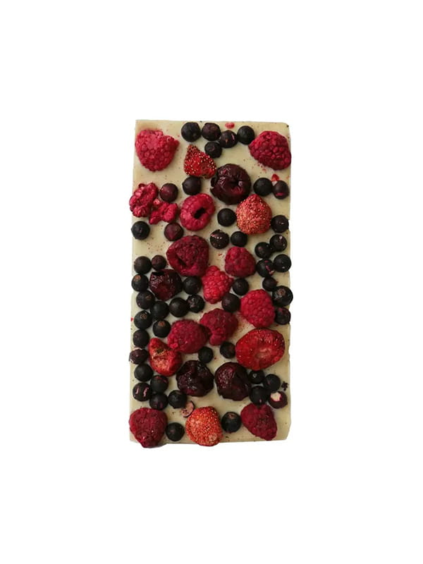 Tabliczka doskonałej, rzemieślniczej białej BIO czekolady z dodatkiem aromatycznych, liofilizowanych owoców (malin, porzeczek, truskawek, wiśni) wyprodukowana w lokalnej manufakturze ze składników najwyższej jakości - idealna przekąska i świetny pomysł na upominek.