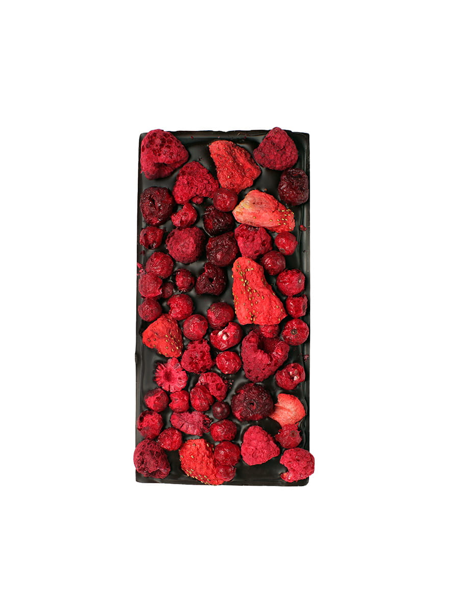 Tabliczka doskonałej, rzemieślniczej gorzkiej czekolady z dodatkiem aromatycznych, liofilizowanych owoców (malin, porzeczek, truskawek, wiśni) wyprodukowana w lokalnej manufakturze ze składników najwyższej jakości - idealna przekąska i świetny pomysł na upominek.