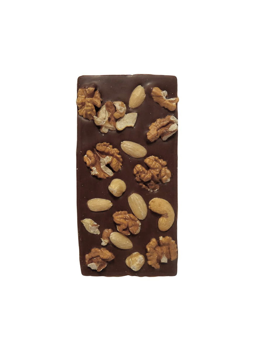 Przepyszna 70% ciemna czekolada z chrupiącymi orzechami włoskimi, laskowymi, migdałami, nerkowcami i solą morską, wyprodukowana w małej, lokalnej manufakturze ze składników najwyższej jakości. Starannie dobrana mieszanka orzechów doskonale komponuje się ze smakiem kakao tworząc smaczną i zdrową przekąskę.