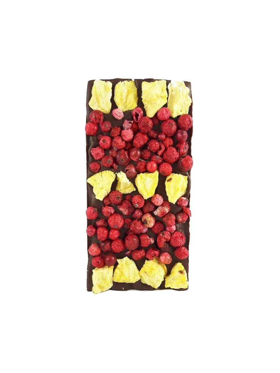 Tabliczka doskonałej, rzemieślniczej mlecznej czekolady z dodatkiem aromatycznych, liofilizowanych owoców (ananasa i czerwonej porzeczki) wyprodukowana w lokalnej manufakturze ze składników najwyższej jakości - idealna przekąska i świetny pomysł na upominek.