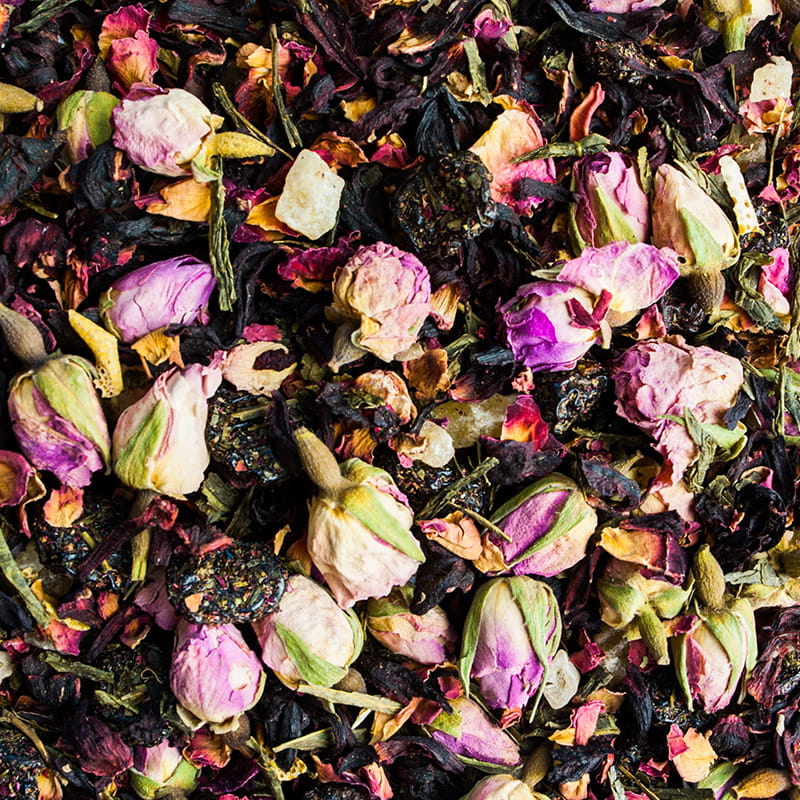 Skład herbaty: zielona herbata liściasta, hibiskus, cząstki wiśni, płatki i pąki róży, kandyzowane kawałki ananasa, skórka pomarańczy, aromaty