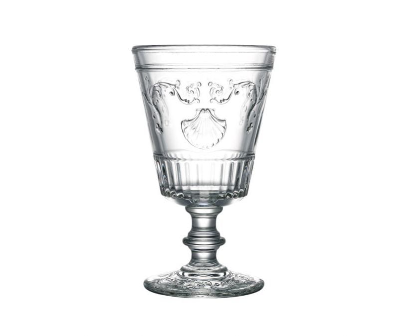 Kieliszek z bogato zdobionej kolekcji Versailles francuskiej marki La Rochere, wykonany z prasowanego szkła i ozdobiony motywami barokowych kwiatów, pnącej się roślinności i przegrzebków. Doskonale sprawdzi się do serwowania zarówno wina czerwonego, białego i różowego, wody oraz zimnych i ciepłych napojów.