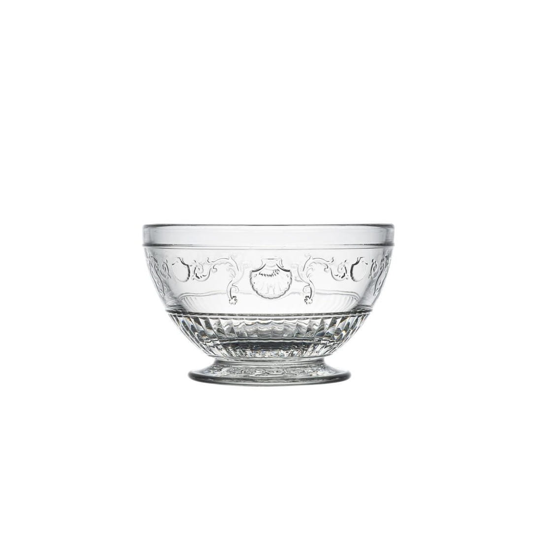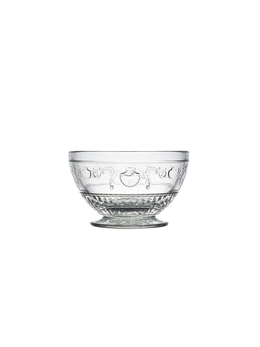 Miseczka z bogato zdobionej kolekcji Versailles francuskiej marki La Rochere, wykonana z prasowanego szkła i ozdobiona motywami barokowych kwiatów, pnącej się roślinności i przegrzebków. Doskonale sprawdzi się do serwowania zimnych i ciepłych przystawek, owoców oraz deserów.