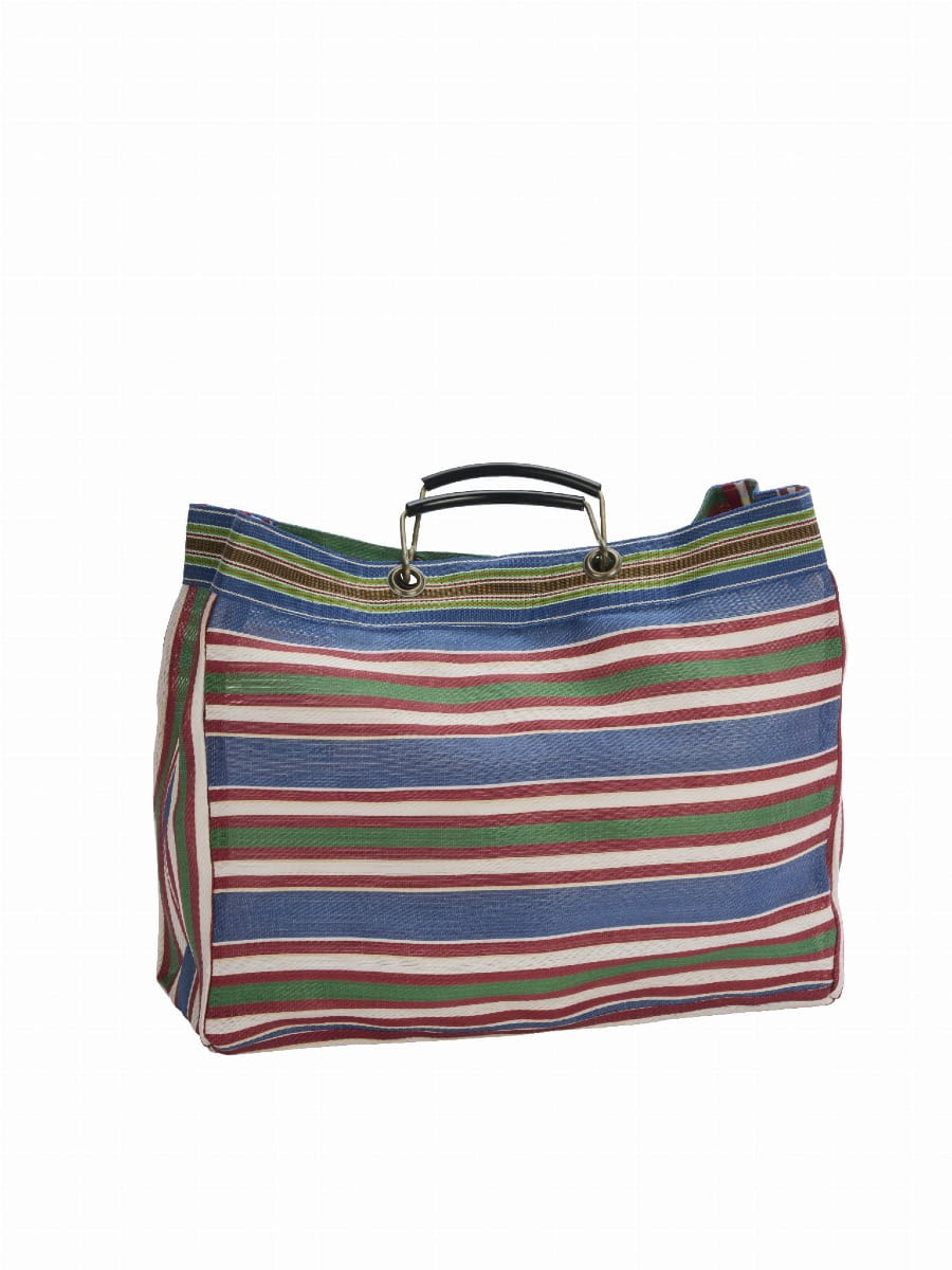 Wykonana w 100% z przetworzonego tworzywa łączy trwałość z troską o środowisko. Kolorowy, paskowany wzór w odcieniach niebieskiego, czerwieni, zieleni i bieli nadaje torbie oryginalny, modny charakter.