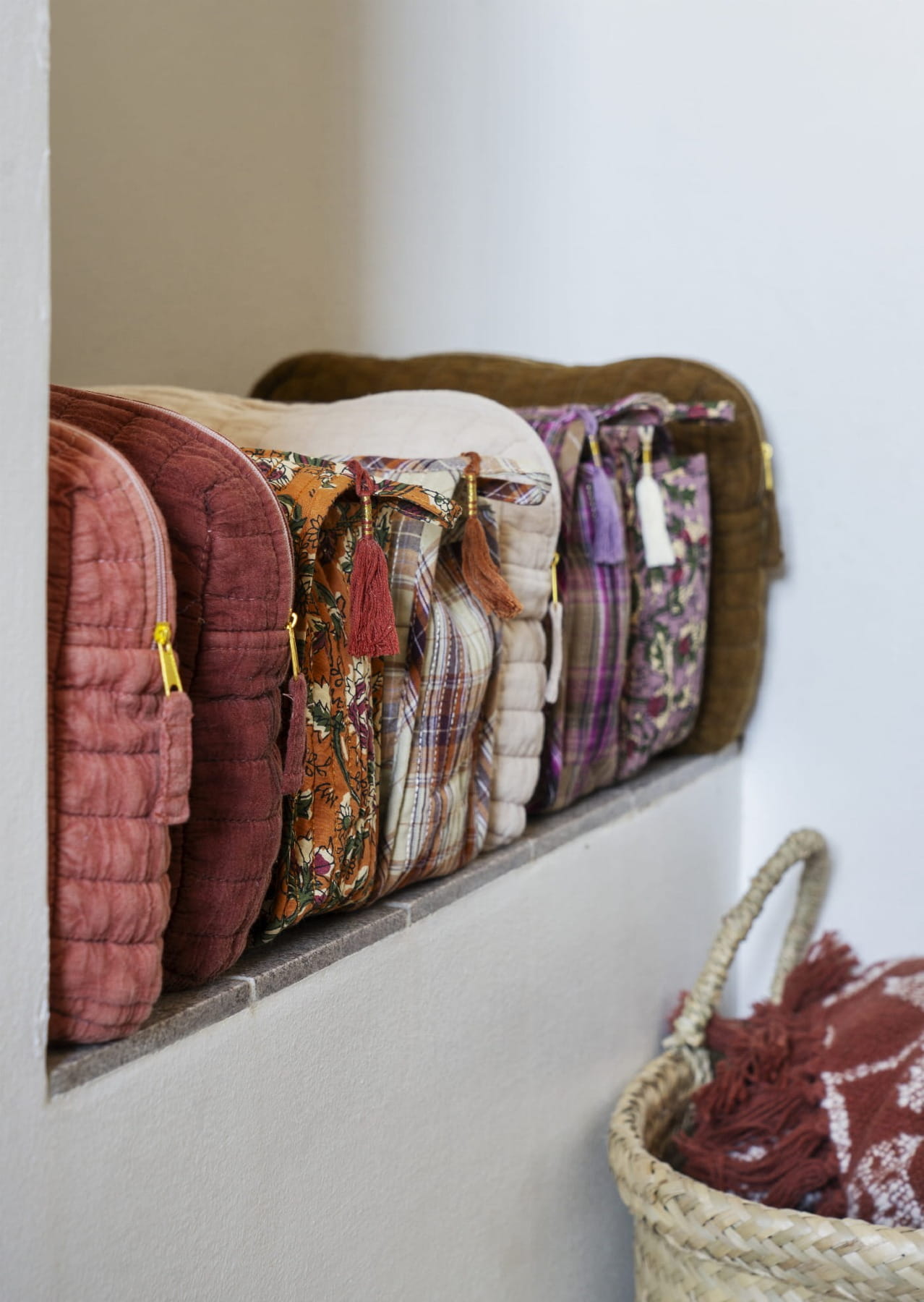 Pikowana kosmetyczka w kolorze tytoniowym to funkcjonalny, a zarazem dekoracyjny element wystroju wnętrza.