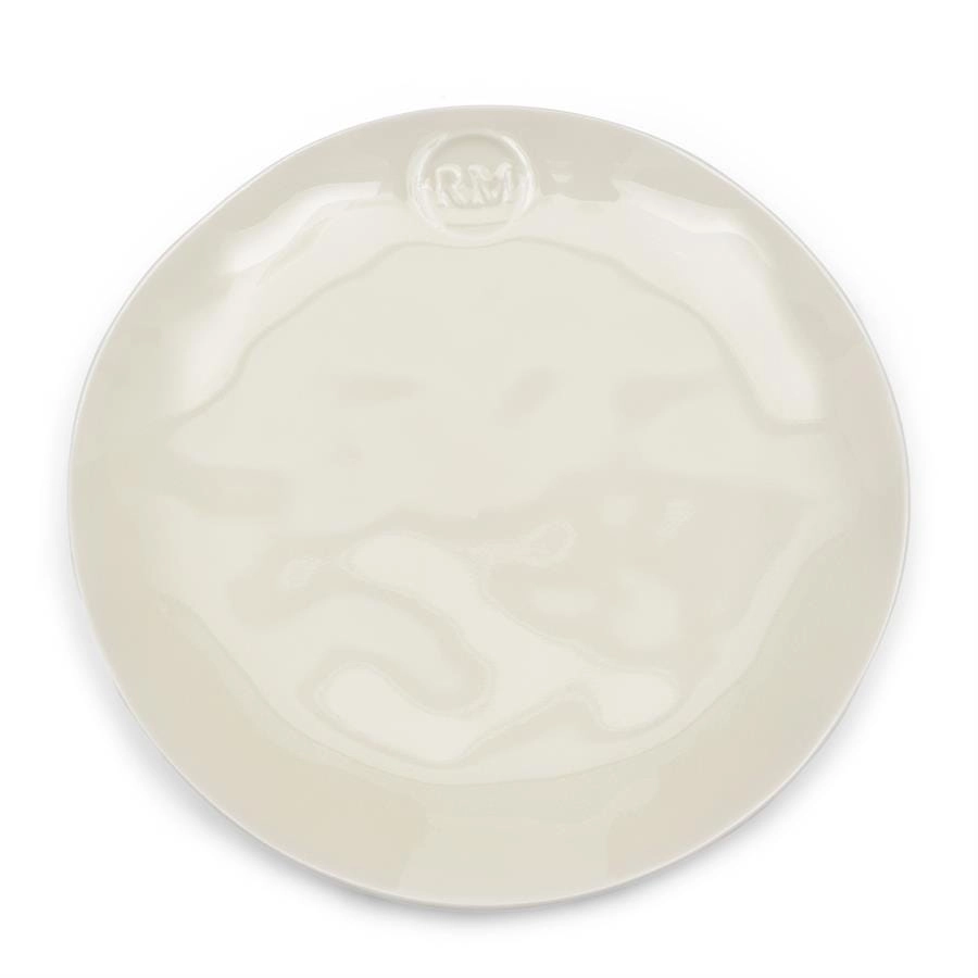 Elegancki talerz śniadaniowy z ceramiki pokrytej błyszczącym szkliwem w klasycznej bieli, z subtelnym tłoczonym logo RM. Idealny do codziennego nakrycia stołu.