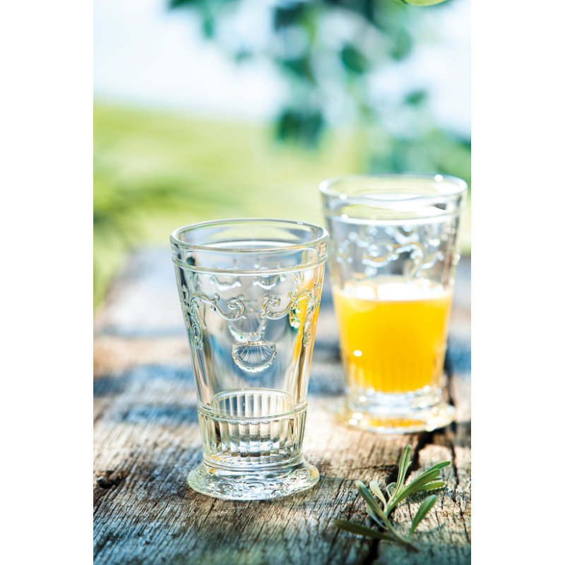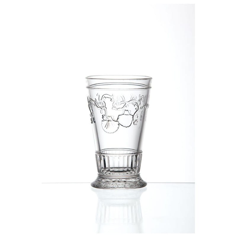 SZklanka z bogato zdobionej kolekcji Versailles francuskiej marki La Rochere, wykonana z prasowanego szkła i ozdobiony motywami barokowych kwiatów, pnącej się roślinności i przegrzebków. Doskonale sprawdzi się do serwowania zimnych i ciepłych napojów.