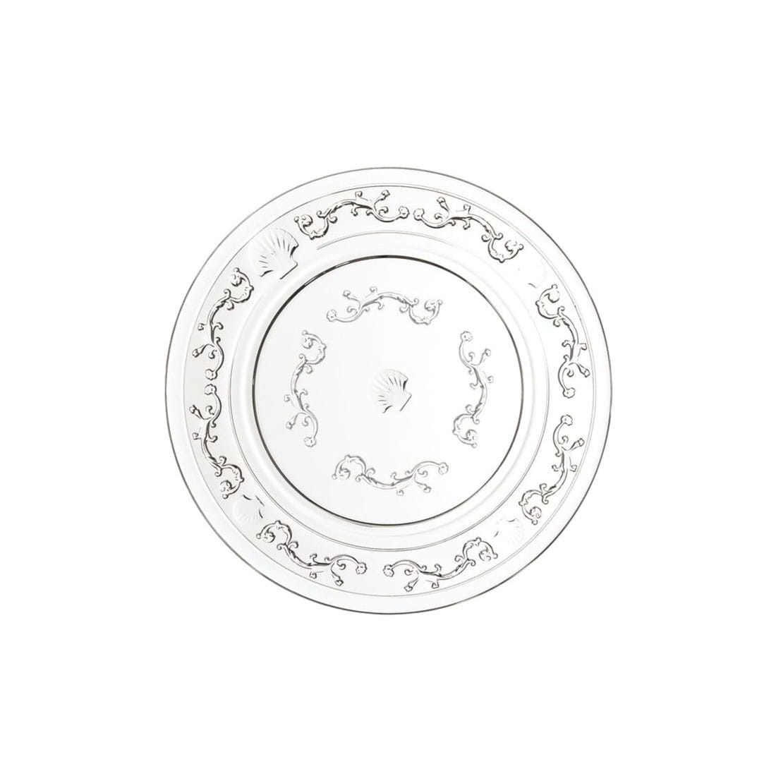 Talerz z bogato zdobionej kolekcji Versailles francuskiej marki La Rochere, wykonany z prasowanego szkła i ozdobiony motywami barokowych kwiatów, pnącej się roślinności i przegrzebków. Doskonale sprawdzi się do serwowania zimnych i ciepłych przystawek.